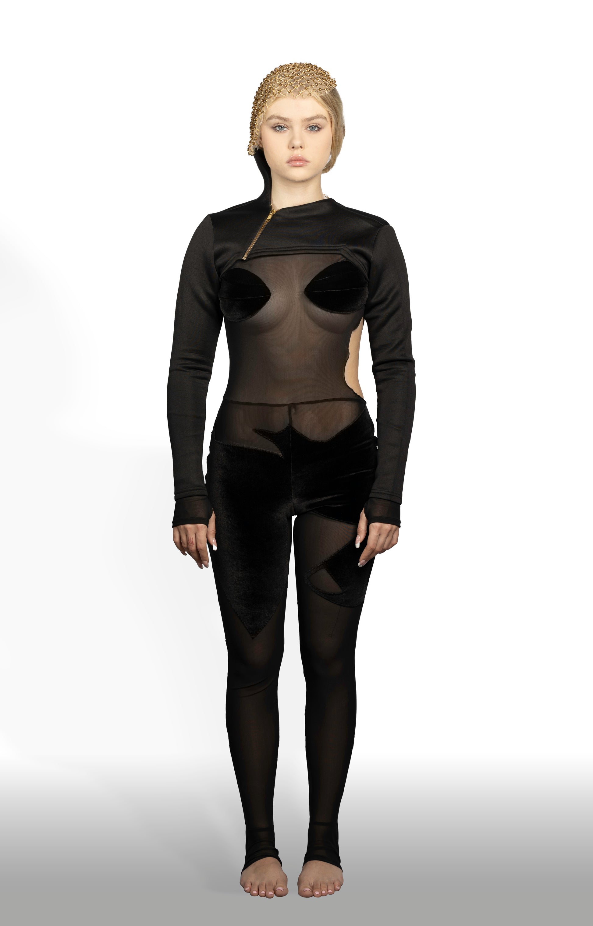 Shrug top made of stretch jersey with an embellished headpiece and back. Featuring clips on the headpiece to secure to the head. Asymmetrical above-bust cut with a zipper closure. Made in Canada.